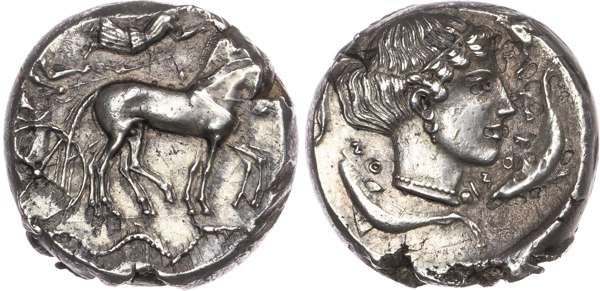 Charioteer driving slow biga right, Nike above, crowning the horses, sea serpent below. Rev. Head of Arethusa facing right, wearing a necklace of pearls and surrounded by four dolphins. (Boehringer 559; SNG ANS 181; Pozzi 579). Good Very Fine.
