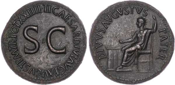 The divine Augustus, radiate, seated left on throne, holding sceptre. Rev. Large ‘SC’. (RIC 69; BMC 129). Extremely Fine. Pleasing dark surfaces. Some smoothing in the fields and around some of the lettering.