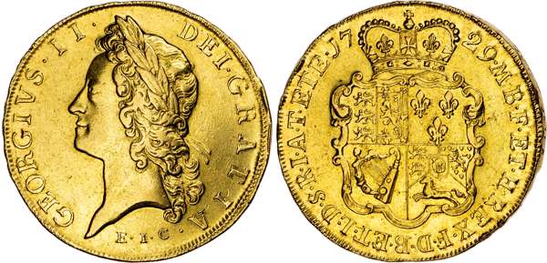 This Five Guinea piece is marked with the initials of the East India Company, founded in London in 1600, and was struck from gold obtained in India and the Far East through trading conducted by the Company at the height of its power –accounting for nearly half of the world's trade at the time this coin was issued. Winning concessions from local rulers in India, the Company had established trading posts aimed at obtaining silk, cotton, indigo and tea in Madras, Bombay, Calcutta, and elsewhere along both coasts of the sub continent and later from China and the Far East. At the end of the first quarter of the 18th. century, when this coin was struck, some 15% of Britain's imports came from India, supplied through the EIC. The company was immensely rich and supplied the Royal Mint with the gold to strike these large impressive coins – making sure it was obvious where the gold had come from. So important had the company become, its presence in India required an ever larger British military obligation to safeguard its operations and personnel. This coin is a reflection of the great wealth of the EIC and the zenith of Britain as a world trading nation.