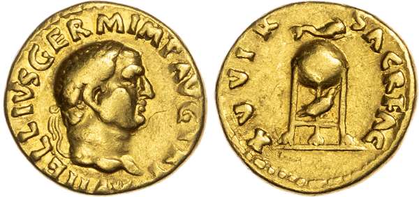 A VITELLIVS IMP AVG P P, laureate head of Vitellius right. Rev. XV VIR SACR FAC, globe on tripod, topped with dolphin, eagle before. (RIC 108; Calico 584). Good Very Fine. Light scratch to obverse. An affordable example of this difficult Twelve Caesars aureus.