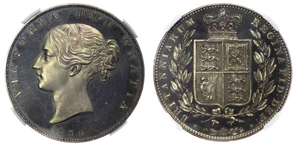 Victoria (1837-1901), Proof Halfcrown, 1839, Type A1. Young diademed head left, with one ornate, one plain fillet, raised W.W. buried in truncation, rev. struck en médaille, crowned shield in wreath, edge plain, (ESC 670; Bull 2708; S.3885). Superb as struck, minimal marks, attractively toned. Encapsulated by NGC PF62 Cameo.