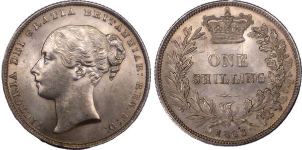 Victoria (1837-1901), Shilling, 1863 over 1. Second young head left, rev. crown over value in wreath (ESC 3023 (1311A) R4; S.3904). Choice almost mint state and surely one of the finest known. Graded and encapsulated by NGC as MS63.