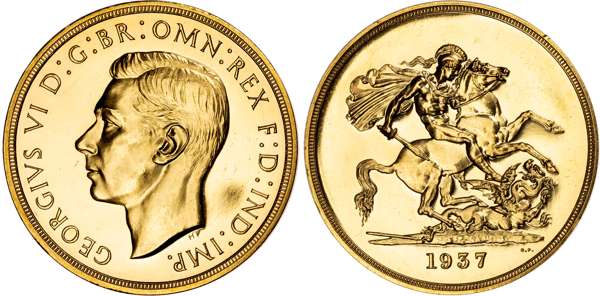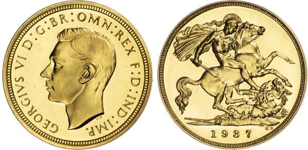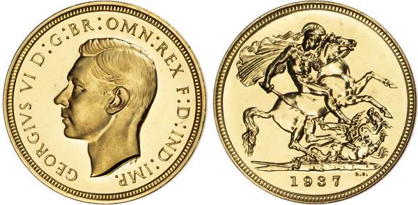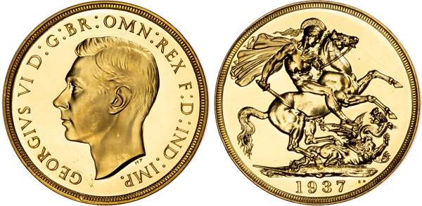 Comprising Five Pound, Two Pound, Sovereign, and Half Sovereign. Bare head left, HP raised below for designer Humphrey Paget, legend and outer border surrounding, GEORGIVS VI D: G: BR: OMN: REX F: D: IND: IMP. Rev, Saint George slaying the dragon right, date in exergue, B.P. to upper right of exergue for Benedetto Pistrucci, edges plain. (S. PS15; W&R;: 435, 437, 439, 442). An over all pleasing set. All coins virtually as struck. The £5 a couple of miniscule nicks on edge visible only on close inspection, minimal marks only. The £2 minimal marks only. The sovereign and half sovereign particularly pleasing. No original case. A set that is worthy of viewing (4).