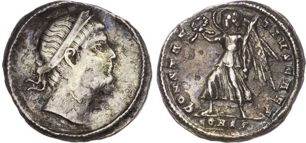 Diademed head right, eyes looking upwards towards heaven. Rev. Victory advancing left, holding wreath and palm, CONSS in exergue. (RIC 128). Fine. Some polishing to the obverse. Pitting in places.