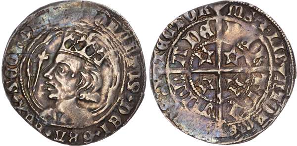 +ROBERTVS DEI GRΛ REX SCOTTORVM, crowned bust, sceptre in front, Rev. +DNS PTECTOR MS T LIB ΛTORMS / VILLΛ DE PERTH+, long cross pattée, mullets in angles, 12h. (S. 5136). Good Very Fine, some peripheral weakness. Toned.