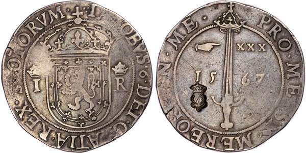 Countermarked with a crowned thistle during the Revaluation of 1578. IACOBVS 6 DEI GRATIA REX SCOTORUM, crowned square-topped shield, crowned I R at either side, Rev. PRO ME SI MEREOR IN ME, crowned sword, 15 / 67 in fields, hand pointing toward XXX above, crowned thistle mintmark in left field. (S. 5472). Host coin Good Fine, countermark Very Fine. Some peripheral weakness.
