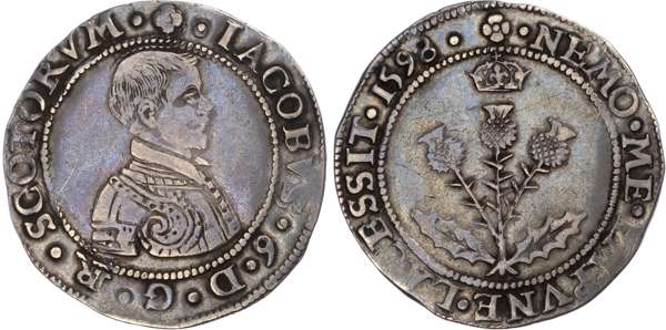 • IACOBVS • D • G • R • SCOTORVM •, bare-headed bust in armour, Rev. • NEMO • ME • IMPVNE • LACESSIT • 1598 •, crowned triple-headed thistle, 1h. (S. 5493). Good Very Fine, toned.
