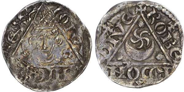 IOHANNES REX, crowned bust facing, sceptre in left hand, quatrefoil in right field, Rev. ROBERD ON DIVE, sun above crescent within triangle, stars in angles, 1.51g/10h. (S. 2668). A Bold Good Very Fine, weakly struck, reverse better.