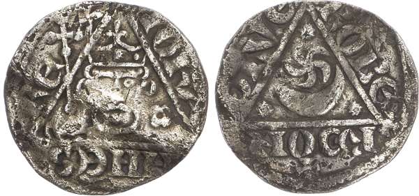 IOHA NNES REX, crowned bust facing, sceptre in left hand, rosette to left, Rev. ROBE RD ON DIVE, sun atop crescent moon within triangle, stars at angles, 1.22g/7h. (S. 6228). Good Fine, slightly creased flan.
