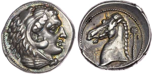 Sicily, Siculo‑Punic (c. 300‑289 BC) AR Tetradrachm, Entella, 16.76g. Head of Herakles facing right, wearing a lion‑skin headdress. Rev. Horse’s head facing left, palm tree behind, Punic 'mmhnt' below, caduceus to left. (Jenkins 5b, 350 (o112/r285)). About Extremely Fine. Delightful iridescent cabinet tone.