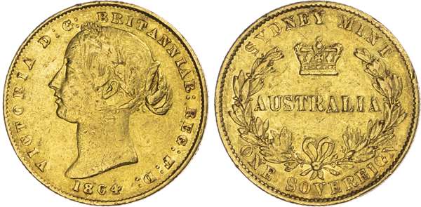Australia, Victoria (1837‑1901), gold Sovereign, 1864, Sydney mint, 7.94g (KM 4; Fr. 10). Very Fine, bag marks and scratches to surfaces.