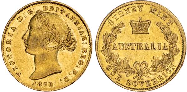 Australia, Victoria (1837‑1901), gold Sovereign, 1870, Sydney mint, 7.98g (KM 4; Fr. 10). Good Very Fine, bag marks.