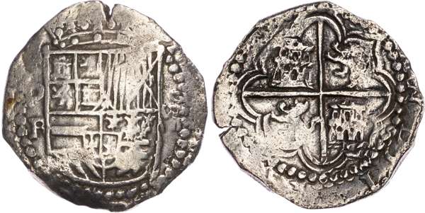 Bolivia, Philip III (1598-1621), silver Cob of 8 Reales, assayer RL, Potosi, 25.93g (KM 5.1; Cal. 675). Good Very Fine, the usual saltwater corrosion to the surfaces. From Nuestra Senora de Atocha shipwreck, which sank in 1622. A choice coin for this wreck. This lot is accompanied with the Certificate of Authenticity (85A-105494) and a tag from Mel Fisher.