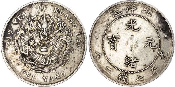 China, Chihli, silver Dollar, 1908, year 34, Pei Yang Arsenal (Chihli), mint, 26.63g (LM 465; K. 208; KM Y-73.2). Very Fine, contact marks to surfaces and some residue. Sold as seen, no returns.