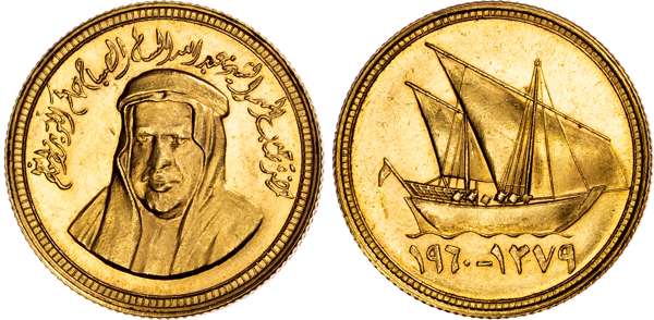Kuwait, Abdullah Al-Salim Al-Sabah (1959-1965), gold Pattern 3 Dinars (also called a Sovereign), London mint, AH 1379 / 1960 AD, legend translation: 'His highness, the exalted Sheikh 'Abdallah al-Salim al-Sabah, ruler of the State of Kuwait', bust of Abdullah Al-Salim Al-Sabah, wearing bisht and gotra, with agal facing slightly left. Rev. Dhow under sail right; below: 1960 – 1379 in Eastern Arabic numerals, 8.01g (KM unlisted; Fr. unlisted). Uncirculated, lustrous surfaces, overall fantastic condition.
