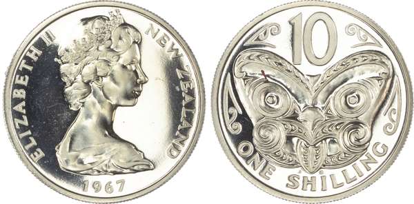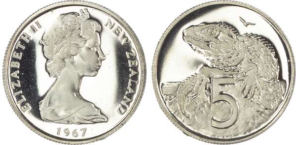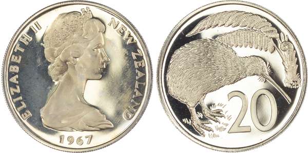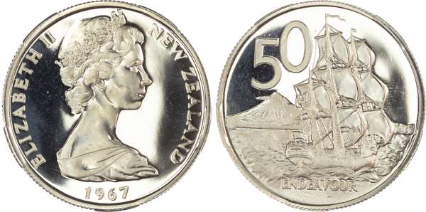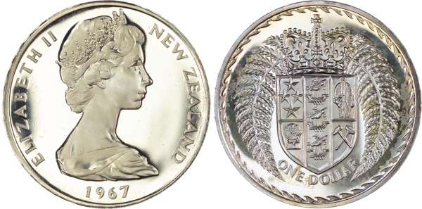 New Zealand, Elizabeth II (1952-2022), First Decimal Proof Set (7), 1967, so-called Ballot Sets, including: Dollar, 50 Cents, 20 Cents, 10 Cents, 5 Cents, 2 Cents, 1 Cent (KM PLS 4). Uncirculated Proofs. Sold without case. A souvenir set of the decimal coins from the first minting in 1967 by the Royal Mint, London. Only 500 of these sets were issued.