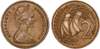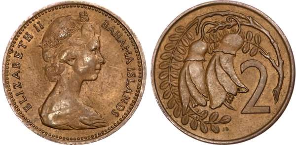 New Zealand, Elizabeth II (1952-2022), mule bronze 2 Cents (2), 1967, mule of Bahamas obverse with reverse of New Zealand (KM 33). Extremely Fine. An interesting type, this error is estimated to have had a mintage of roughly 50,000. (2)
