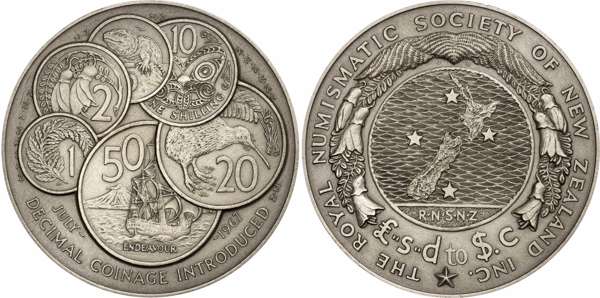 New Zealand, Elizabeth II (1952-2022), Royal Numismatic Society of New Zealand, silver Medal commemorating Decimal Coinage Introduction, depicting James Berry's famous New Zealand coin designs, minted for the Royal Numismatic Society of New Zealand 1967, 153.95g, 63mm diameter. Uncirculated, matte finish, sold without the original box.