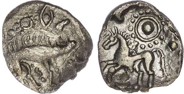Stylised boar right, spear in shoulder, ‘sun and moon’ above. Rev. Stylised horse left, pelletal sun above, ‘sun and moon’ below. (ABC 1779; BMC 3197). Good Very Fine. Somewhat bent and slightly cracked.