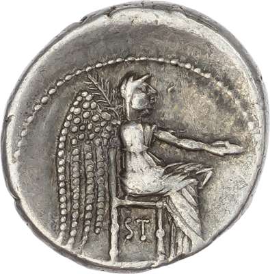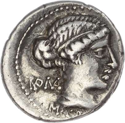 ROMA / M•CATO, Draped bust of Roma right. Rev. Victory seated right, holding patera and palm frond, [VICTRIX] in exergue. (Crawford 343/1c; Sydenham 596a). Very Fine.