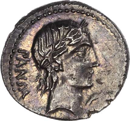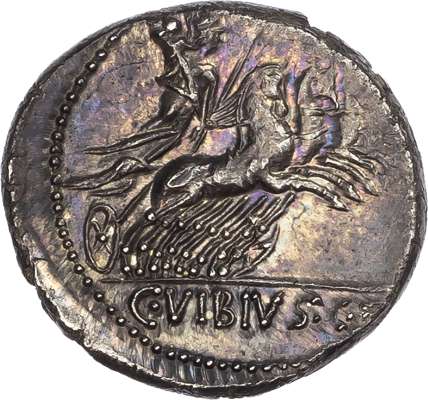 PANSA, laureate head of Apollo facing right, symbol below chin. Rev. Minerva, holding trophy, spear and reins, driving quadriga right, C VIBIVS C F in exergue. (Crawford 341/5b; Sydenham 685). Extremely Fine. Attractive dark toning with hints of purple.