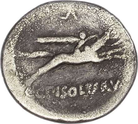 Laureate head of Apollo facing right, uncertain symbol behind. Rev. Horseman, holding reins and palm frond, galloping right, L•PISO•FRVGI in exergue. (Crawford 340/1; Sydenham 663). Near Fine.