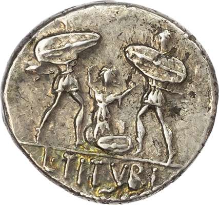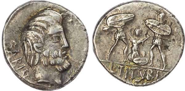 SABIN, bare head of King Tatius facing right, palm frond to right. Rev. Tarpeia facing, buried to her waist in shields, two soldiers either side, preparing to hurl their shields, L•TITVRI in exergue. (Crawford 344/2b; Sydenham 699). Extremely Fine. Some toned lustre.