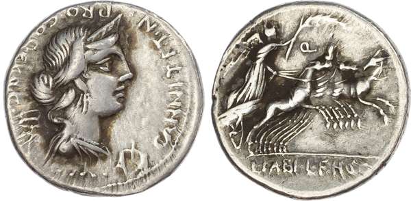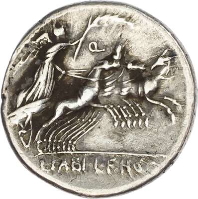 C•ANNI•T•F•T•N•V•PRO•COS•EX•S•C• , diademed and draped bust of Anna Perenna right, caduceus to left, scales to right. Rev. L•FABI•L•F•HISP, Victory driving quadriga right, holding reins and palm, Q above. (Crawford 366/1b; Sydenham 749). Good Very Fine.