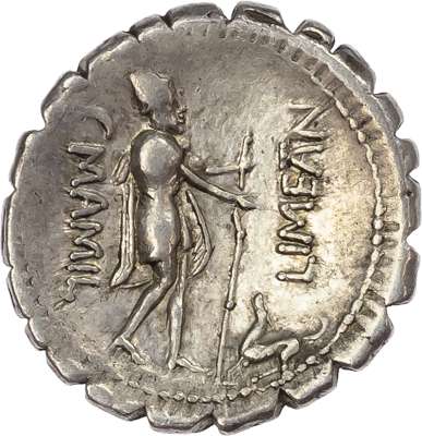 Draped bust of Mercury right, wearing winged petasos, M above caduceus to left. Rev. C • MAMIL – LIMETAN, Ulysses, wearing pileus and mariner’s attire, walking left, leaning on staff and extending his hand towards his dog, Argus. (Crawford 362/1; Sydenham 741). Good Very Fine.