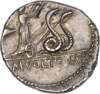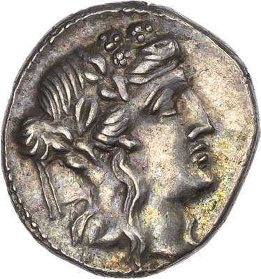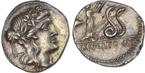 Head of Bacchus right, wearing ivy-wreath. Rev. Ceres right, in biga of snakes, holding a torch in each hand, M•VOLTEI•M•F in exergue. (Crawford 385/3; Sydenham 776). Extremely Fine. Reverse off-centre.