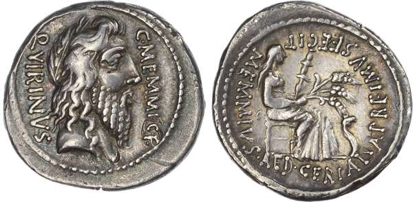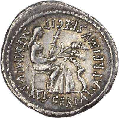 QVIRINVS / C • MEMMI • C • F, laureate head of Quirinus right. Rev. MEMMIVS • AED • CERIALIA • PREIMVS • FECIT, Ceres seated right, holding torch and three stalks of grain, serpent to right. (Crawford 472/2; Sydenham 921). Good Very Fine or better. Pleasing tone. Slight mark to obverse.