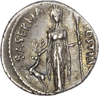 Bare head of Gallia facing right, carnyx behind. Rev. HOSTILIVS - SASERNA, Diana (Artemis) of Ephesus standing facing, holding spear, stag leaping left. (Crawford 448/3; Sydenham 953). Good Very Fine.