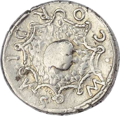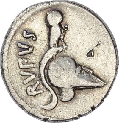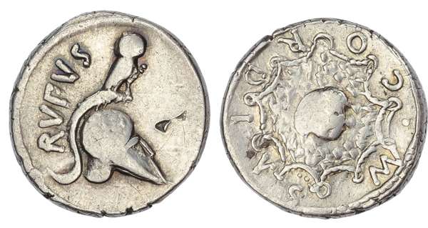 RVFVS, crested Corinthian Helmet right, topped with an owl. Rev. MN•CORDIVS, aegis of Minerva, decorated with head of Medusa. (Crawford 463/2; Sydenham 978). Very Fine. Banker’s mark to obverse.