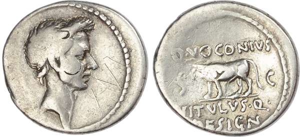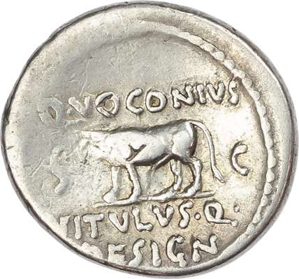 Laureate head of Caesar right. Rev. Q•VOCONIVS / VITVLVS•Q• / DESIGN, bull left, S – C across fields. (Crawford 526/4; CRI 331). Good Fine. Graffito. A pleasing portrait.