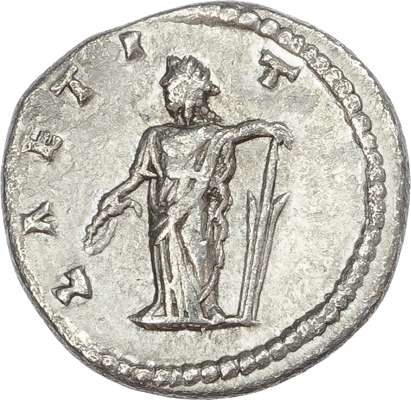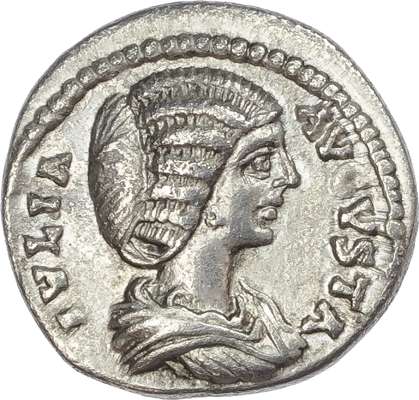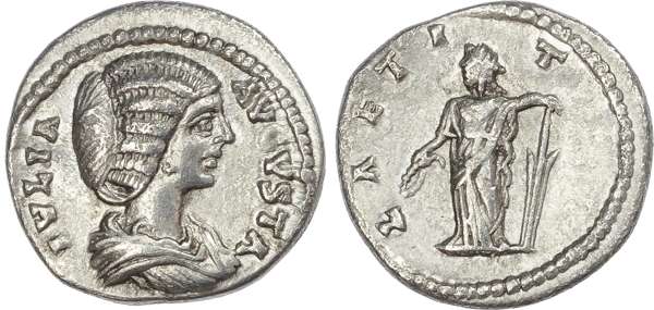 Draped bust of Julia Domna right. Rev. Laetitia standing left, holding wreath and rudder. (RIC 561; BMC 45). Good Very Fine Fine.