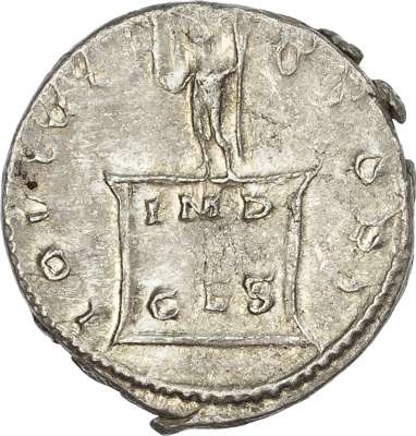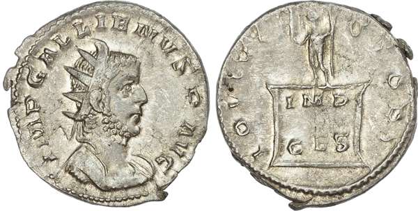 IMP GALLIENVS P AVG, radiate and cuirassed bust right. Rev. IOVI VI-CTORI, Jupiter standing left on cippus inscribed IMP / CES. (RIC 22; RSC 397). Extremely Fine.