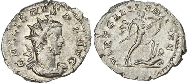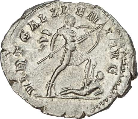IMP GALLIENVS P F AVG, radiate and cuirassed bust right. Rev. VIRT GALLIEN-I AVG, Emperor, holding spear and shield, trampling captive right. (RIC 54). Good Very Fine.