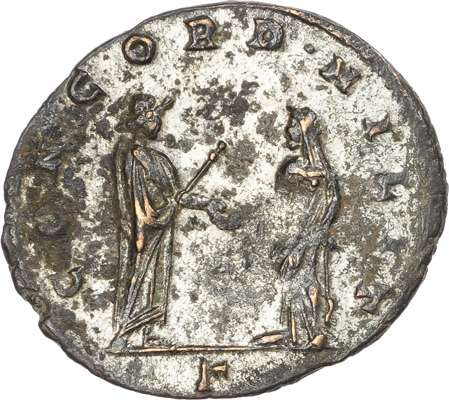 Radiate and cuirassed bust of Aurelian right. Rev. Aurelian (right) and Concordia (left) standing facing. (RIC 391). Very Fine.