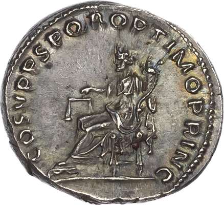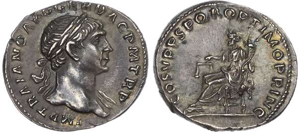 IMP TRAIANO AVG GER DAC PM TR P, laureate head Trajan right, with slight drapery. Rev. COS V P P SPQR OPTIMO PRINC, Aequitas seated left, holding scales and cornucopiae. (RIC 119; BMC 281; RSC 86). Extremely Fine.