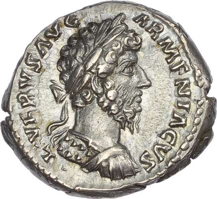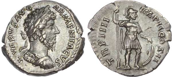 L VERVS AVG ARMENIACVS, laureate, draped and cuirassed bust of Lucius Verus right. Rev. TR P IIII IMP II COS II, Mars standing right, holding spear and shield. (RIC 515). About Extremely Fine. Pleasing cabinet tone.