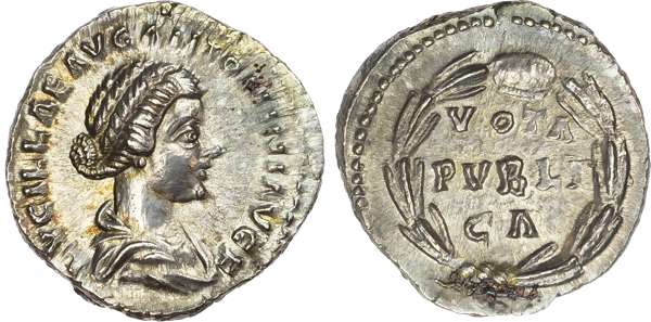 LVCILLA AVG ANTONINI AVG F, draped bust of Lucilla right. Rev. VOTA / PVBLI / CA within a laurel wreath. (RIC 791; BMC 329). Extremely Fine. Reverse somewhat weakly struck.