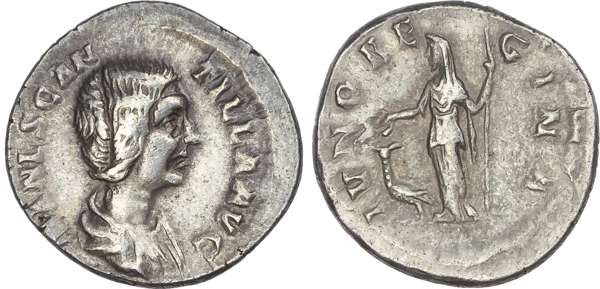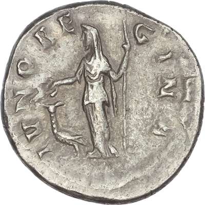 MANL SCAN-TILLA AVG, draped bust of Manlia Scantilla right. Rev. IVNO RE-GINA, Juno standing left, holding sceptre and patera, peacock to left. (RIC 7a; BMC 11; RSC 2). Good Very Fine or better. Rare.