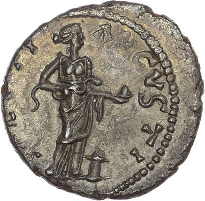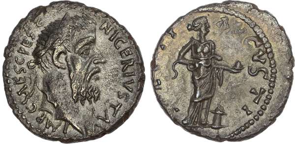 IMP CAES C PESC NIGER IVST AVG, laureate head of Pescennius Niger right. Rev. SALVTI AVGVSTI, Salus standing right, feeding snake, altar to right. (RIC 77; BMC 312A). Extremely Fine for issue. Cabinet tone. Rare.