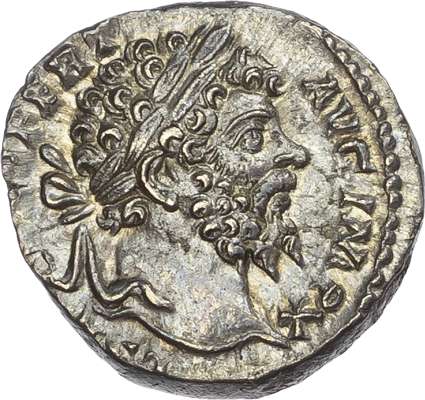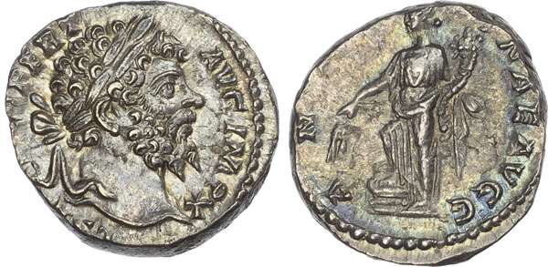 IMP CAE L SEP SEV PERT AVG COS II, laureate head of Severus right. Rev. M-ONET A-VG, Moneta standing left, holding scales and cornucopiae. (RIC 411a; RSC 330/ BMC 380). Extremely Fine. Toned lustre.