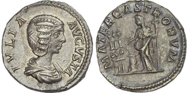 IVLIA AVGVSTA, draped bust of Julia Domna right. Rev. MATER CASTRORVM (mother of the army camps), Julia Domna standing left, sacrificing over altar, three standards to left. (RIC 567 var. (three standards, legend variation)). Extremely Fine. Very Rare and important issue.