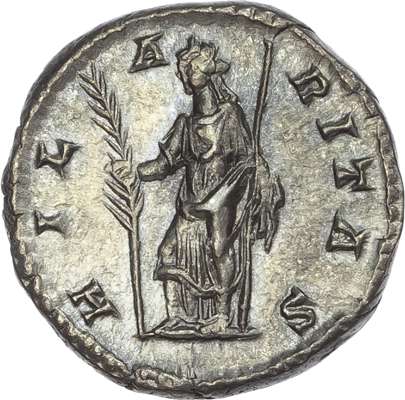 IVLIA AVGVSTA, draped bust of Julia Domna right. Rev. HIL-A-RITAS, Hilaritas standing left, holding sceptre and palm. (RIC 555; BMC 32). Extremely Fine.
