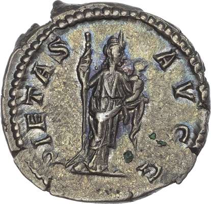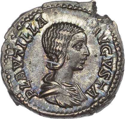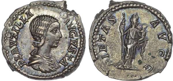 PLAVTILLA AVGVSTA, draped bust of Plautilla right. Rev. PIETAS AVGG, Pietas standing right, holding sceptre and infant. (RIC 367; BMC 422). Extremely Fine. Pleasing cabinet tone.