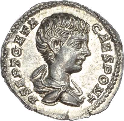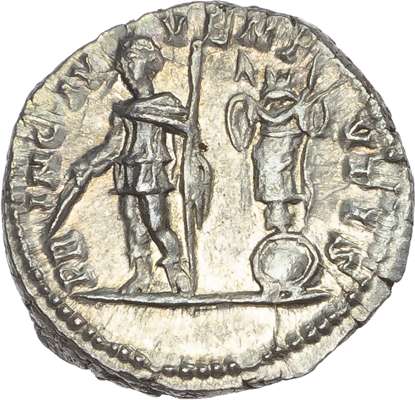 P SEPT GETA CAES PONT, bareheaded and draped bust of Geta right. Rev. PRI-NC IVV-ENTVT-IS, Geta standing left, holding baton and sceptre, trophy of arms to right. (RIC 18). Good Extremely Fine. Lustrous.