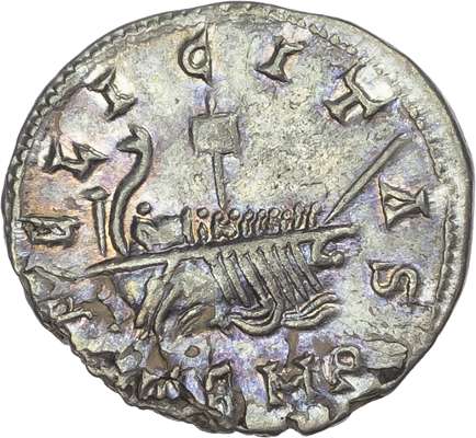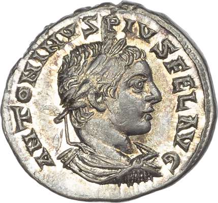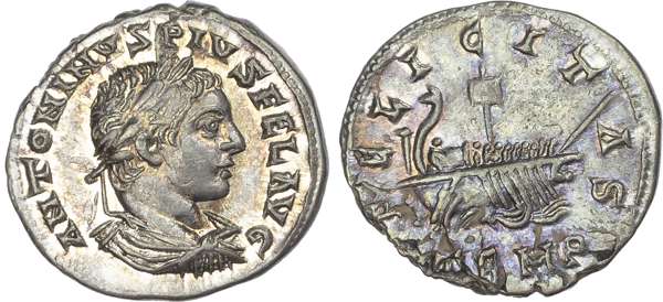 IMP ANTONINVS PIVS FELIX AVG, laureate, draped and cuirassed bust of Elagabalus right. Rev. FELICITAS, galley sailing right, waves below, slanted mast at prow, vexillum amidships, acrostolium at stern, TEMP in exergue. (RIC 188; BMC 277). Obverse Good Extremely Fine. Reverse Extremely Fine with some pitting. Iridescent cabinet tone.