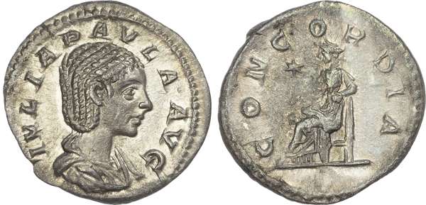 IVLIA PAVLA AVG, draped bust of Julia Paula right. Rev. CONCORDIA, Concordia seated left, holding patera, star to left. (RIC 211; BMC 172). Extremely Fine.